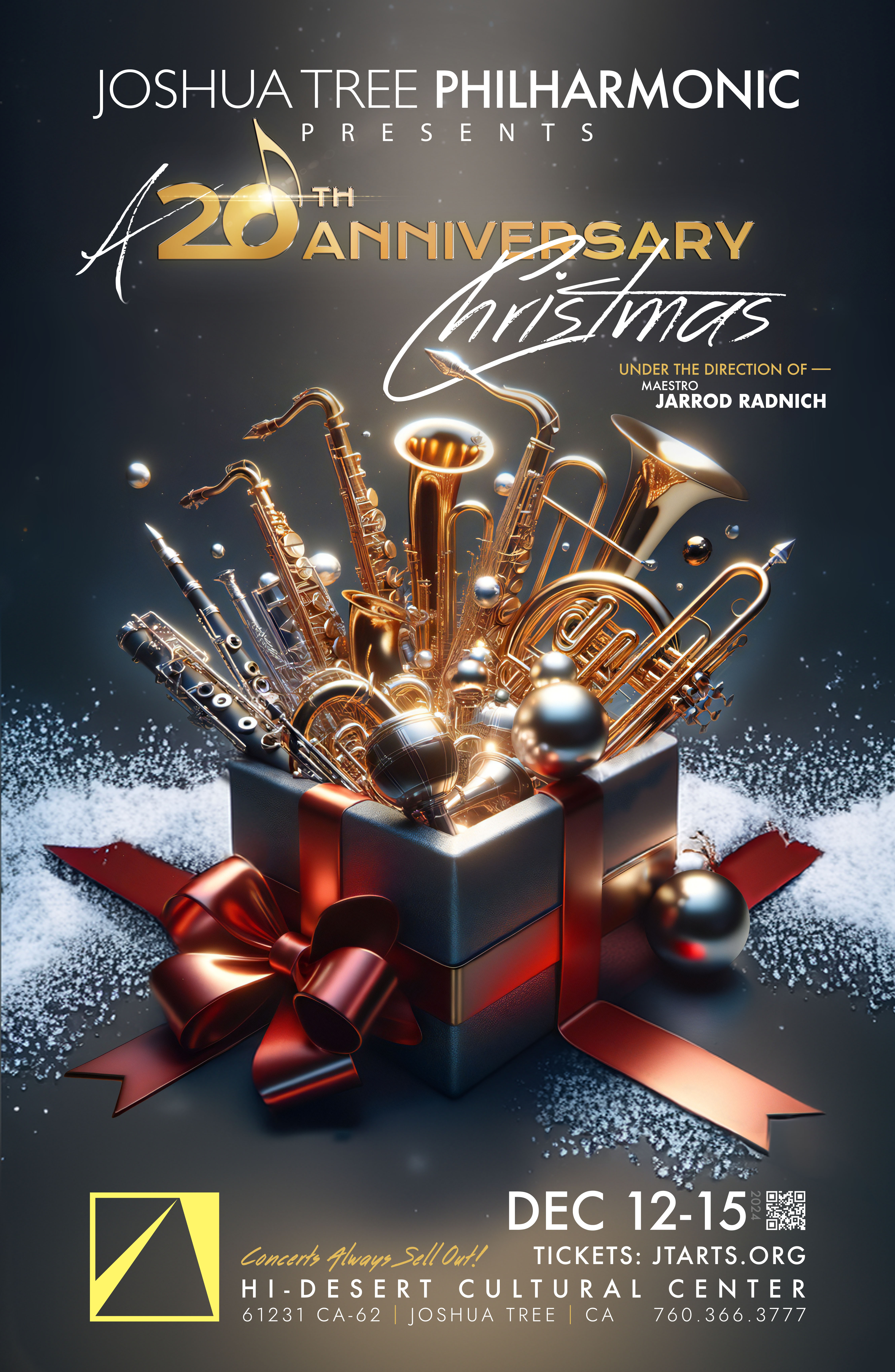 The acclaimed Joshua Tree Philharmonic performs classical, jazz, and big band holiday symphonic music for its December concert series, “A 20th Anniversary Christmas”—running December 12th-15th, 2024!